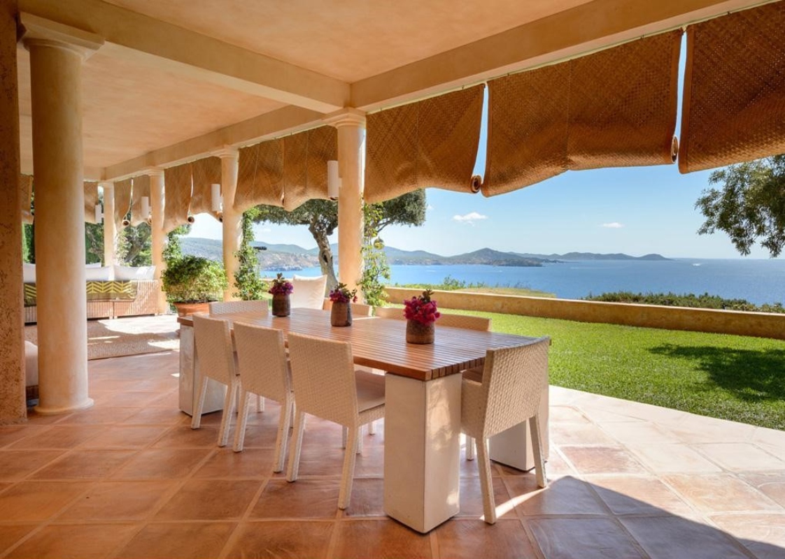 Villa located in Es Cubells, on the south coast of Ibiza, has recently been renovated in an elegant and modern style and has incredible sea views from almost every room, as well as from the spacious terraces, the large pool area and the grass. Villa Orion has five rooms, including a giant master suite. Three of these rooms (the main one, a double en suite and a double with a separate bathroom) are located on the top floor of the main house. There is an additional double bathroom in an annex, very easily accessible from the other rooms. The last double room with bathroom is an elegant room that opens onto the pool terrace. All rooms have sea views, air conditioning and access to the outside terraces. The main floor is below the bedrooms and is a spacious open plan area with large sliding doors that are recessed into the walls creating a fantastic indoor / outdoor feel. You walk from the living room to the dining room terrace and the lawn which in turn descends to the pool terrace and bar.
