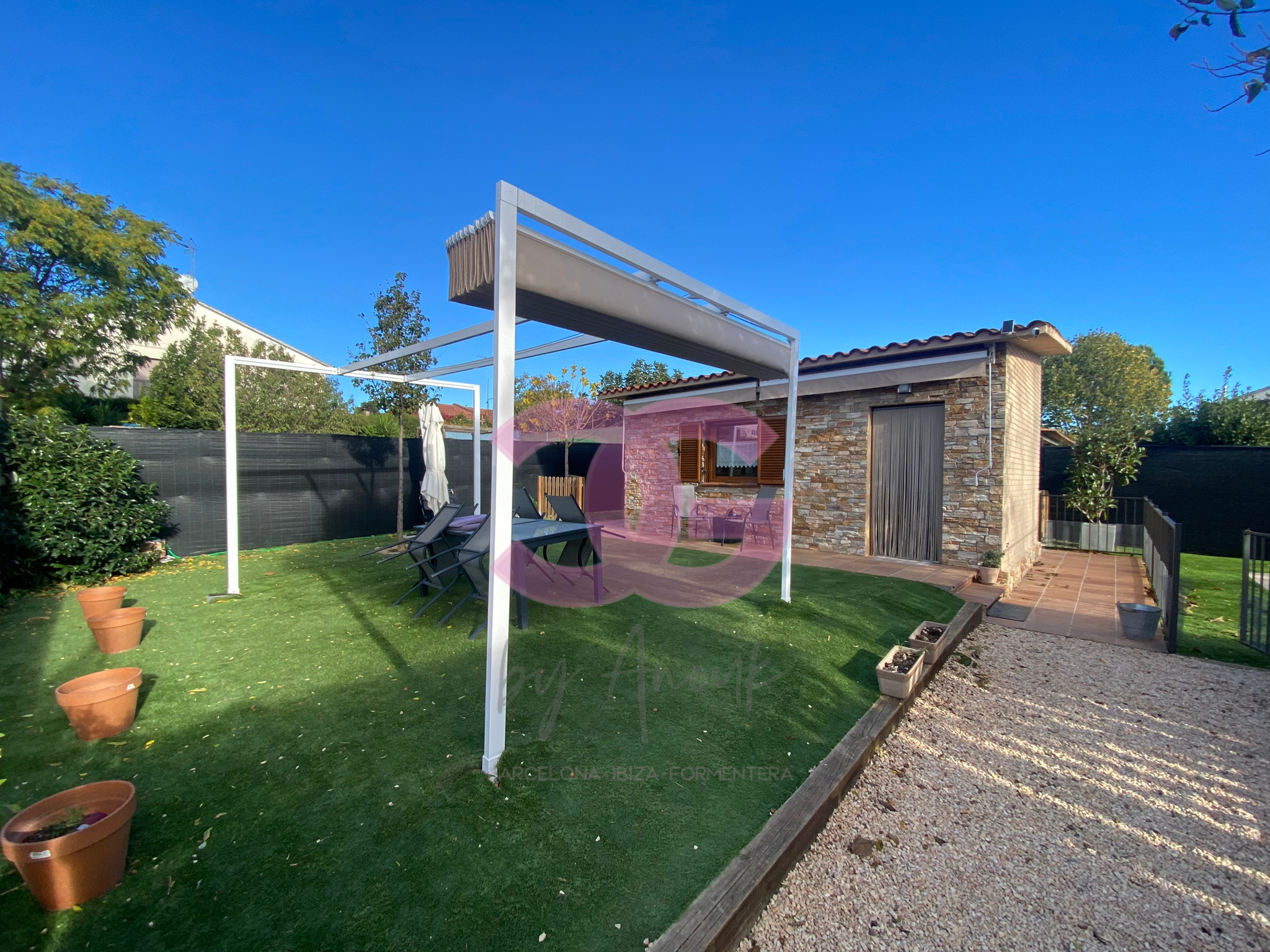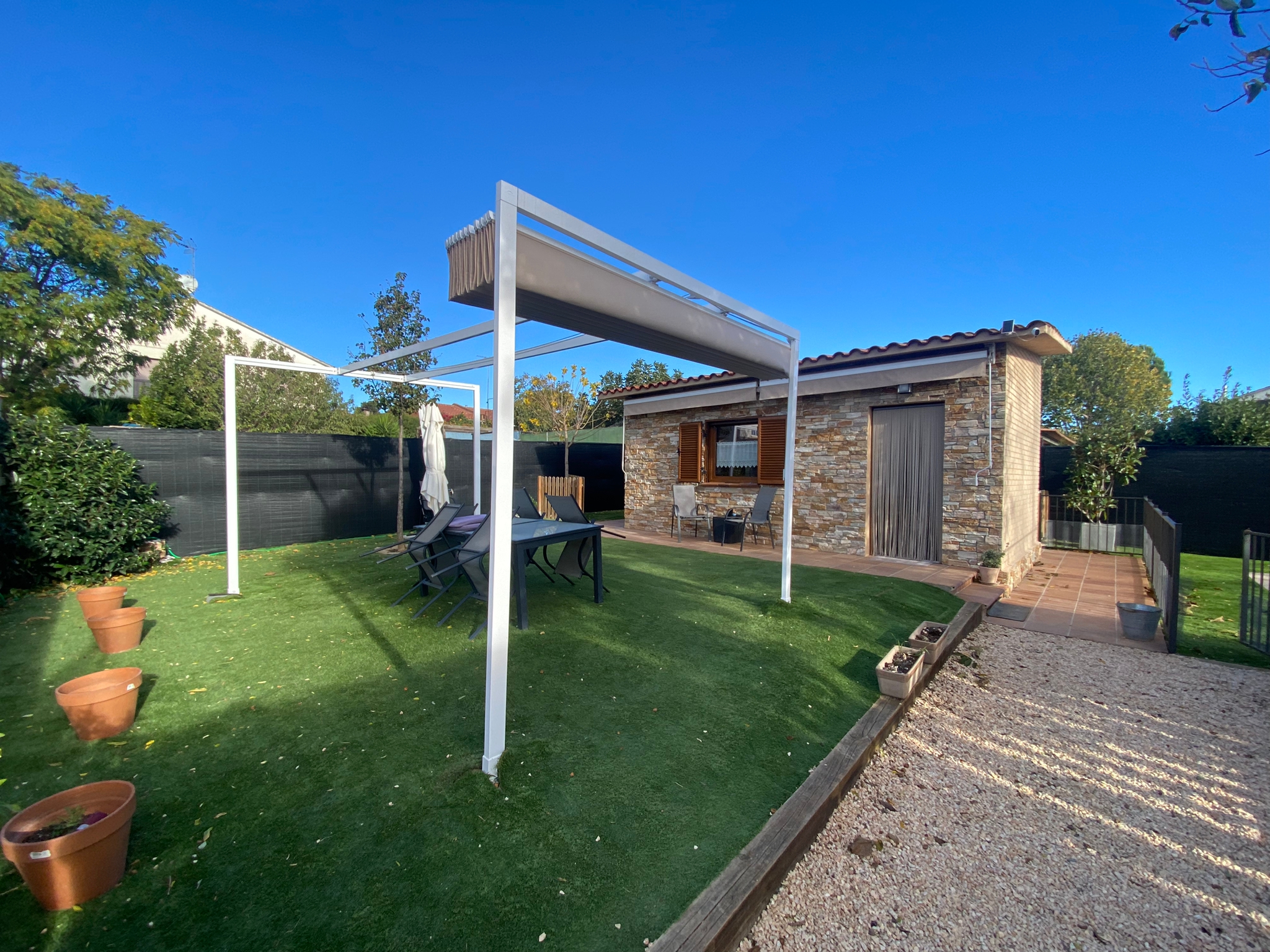 La casita de invitados es de nueva construcción y consta de un espacio diáfano con materiales de excelente calidad. En la parte de delante encontramos una zona ajardinada que puede ser un agradable comedor de verano con toldo ya instalado y, detrás de la casita, la zona de la barbacoa ideal para las épocas de verano.