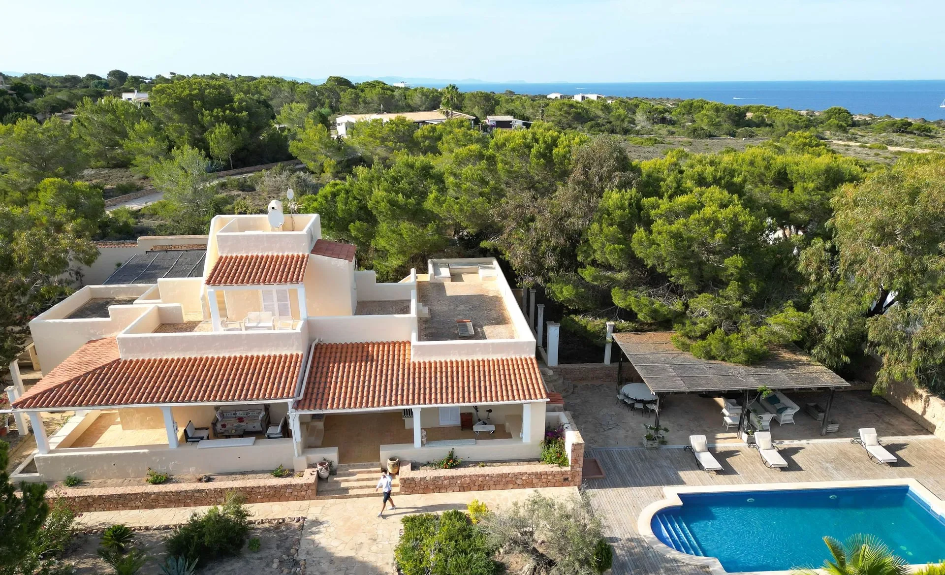 Esta impresionante villa se encuentra en una ubicación privilegiada en el centro de la isla de Formentera, en la tranquila zona de Cala Embaster. Con vistas panorámicas al mar desde las terrazas superiores y una piscina privada, esta propiedad ofrece una experiencia exclusiva.