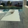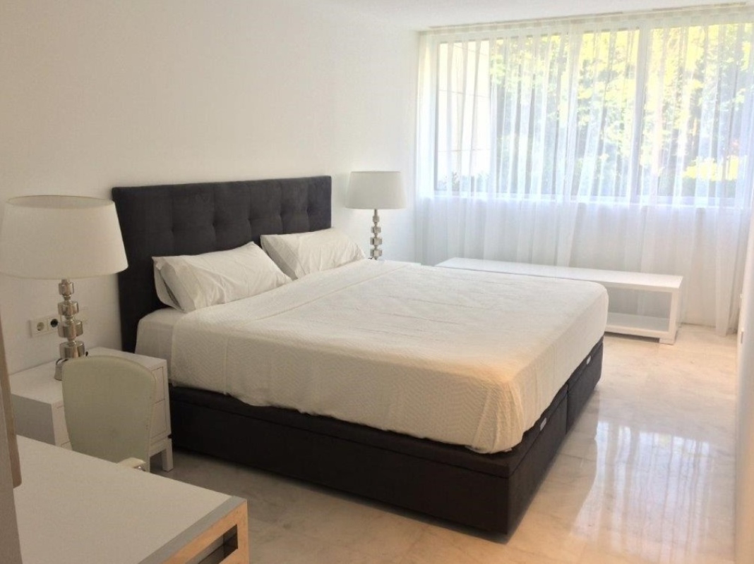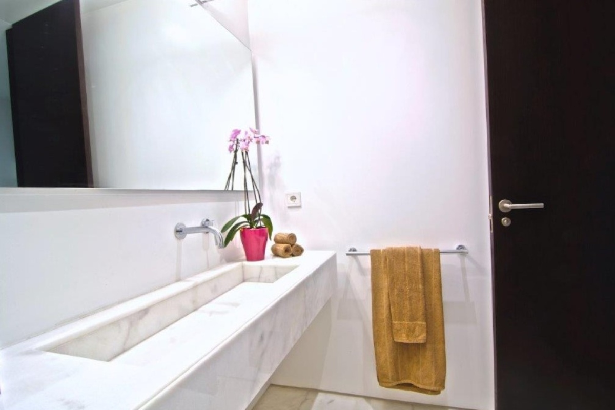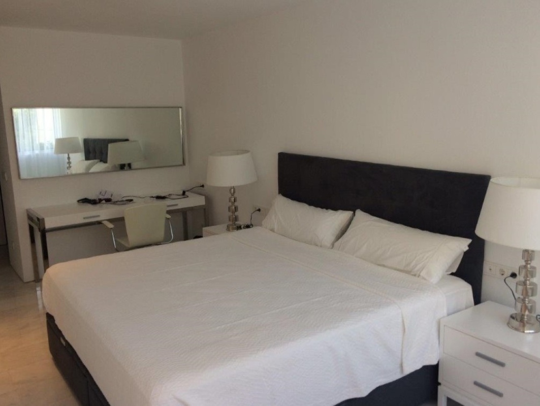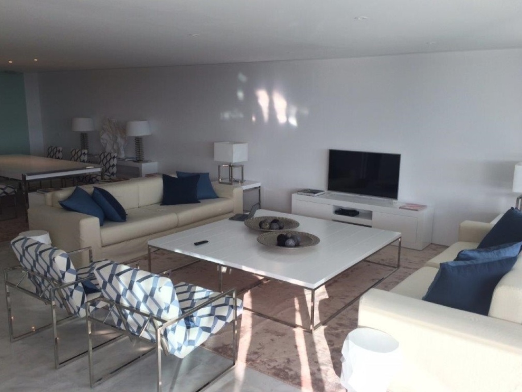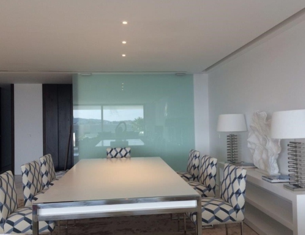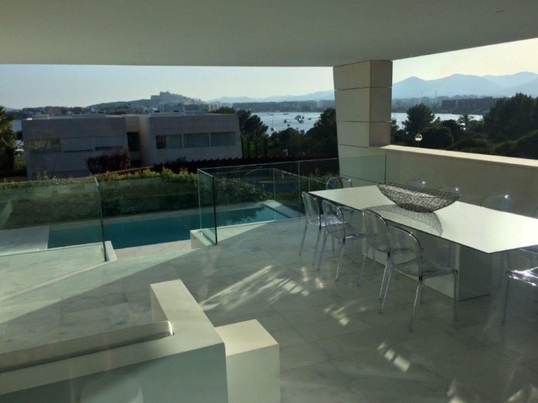 La casa, a estrenar, está situada en Talamanca. Se trata de una vivienda de diseño moderno en la primera planta de una de las urbanizaciones más exclusivas de la isla de Ibiza, diseñadas por el prestigioso estudio de arquitectura español A-CERO-Joaquín Torres Architects. La casa tiene 340 m2. Su espacio está distribuido en 4 habitaciones tipo suite, cada una con cuarto de baño, suelos de mármol, armarios empotrados, aire acondicionado y televisión con canal plus. A la hora de aparcar no hay problema pues el recinto tiene dos plazas de garaje. Además cuenta con seguridad 24 horas al día, alarma conectada a la policía, 60 cámaras de vigilancia y 60.000 m2 de terreno vallado. Mención aparte merece la piscina infinity de 1.600 m2: una zona de relax rodeada de tumbonas desde la que se puede disfrutar de mágicos atardeceres. Se encuentra a tan solo tres metros de la playa y muy cerca del paseo marítimo. La casa se encuentra en la urbanización Es Pouet de Talamanca, en la mejor primera línea de la isla de Ibiza, en plena bahía de Talamanca, a apenas 2 kilómetros del pueblo de Jesús y 4 de Ibiza ciudad y el Paseo Marítimo de Ibiza, a lo largo del cual se extienden los puertos deportivos de Ibiza Nueva y Marina Botafoch, así como el exclusivo campo de golf Rocasilla.