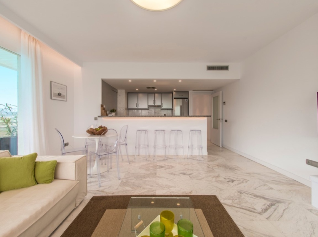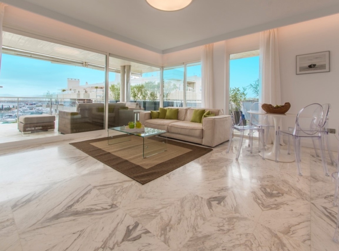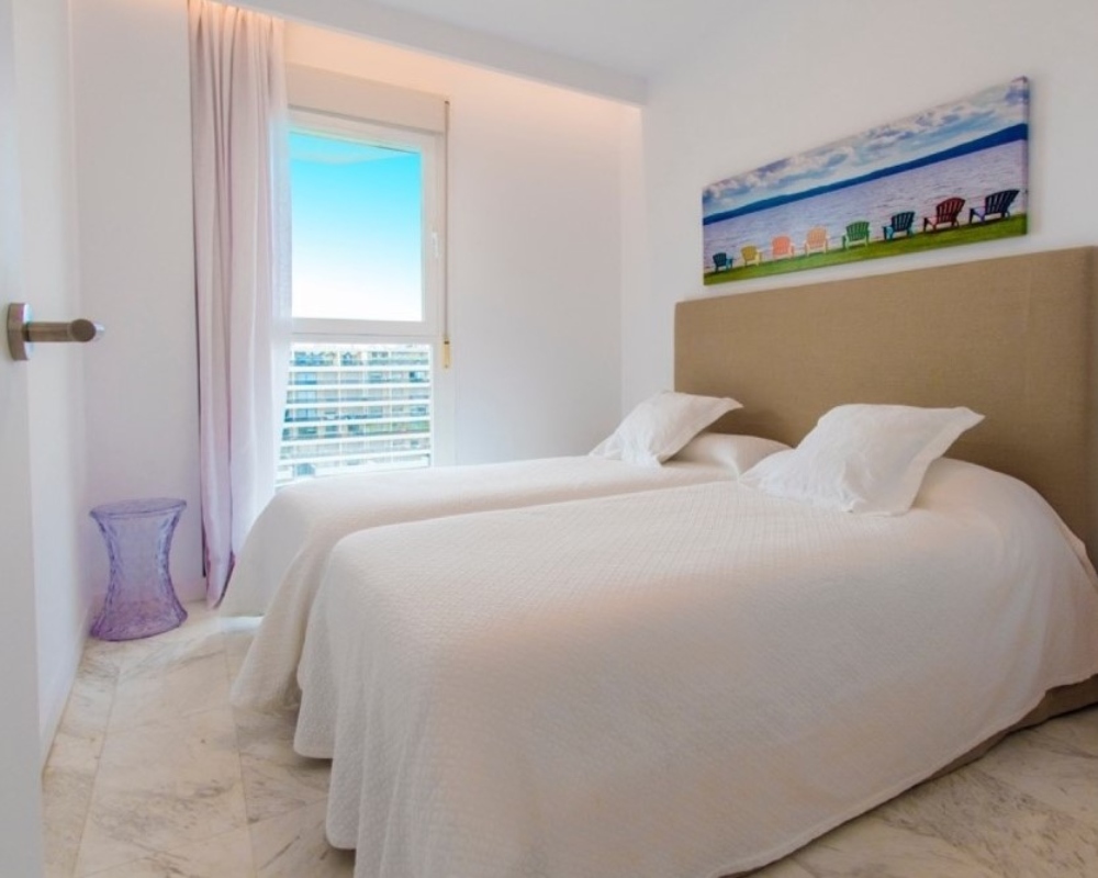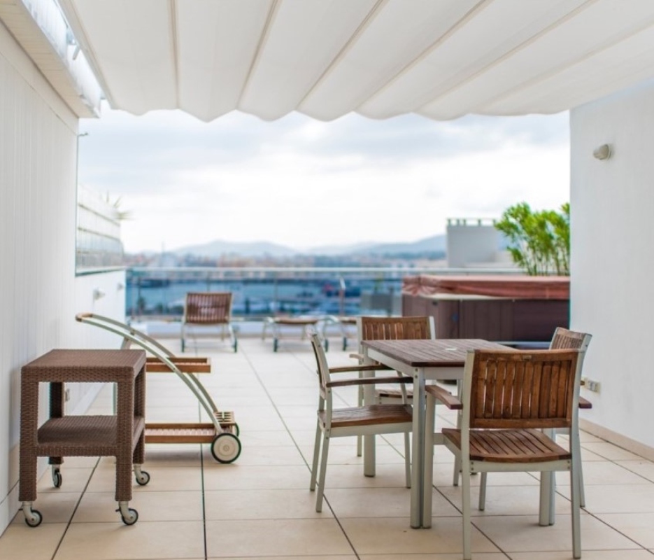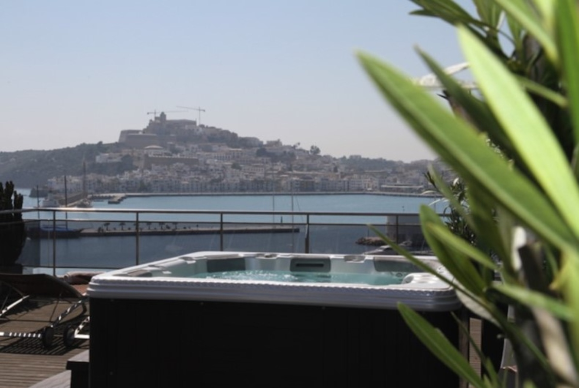 Ático en el Paseo Marítimo de Ibiza. Moderno y lujoso ático con dos habitaciones y dos baños. Preciosas vistas. Solárium privado con jacuzzi, ducha exterior. Cocina integrada al salón, aire acondicionado en todos los ambientes.